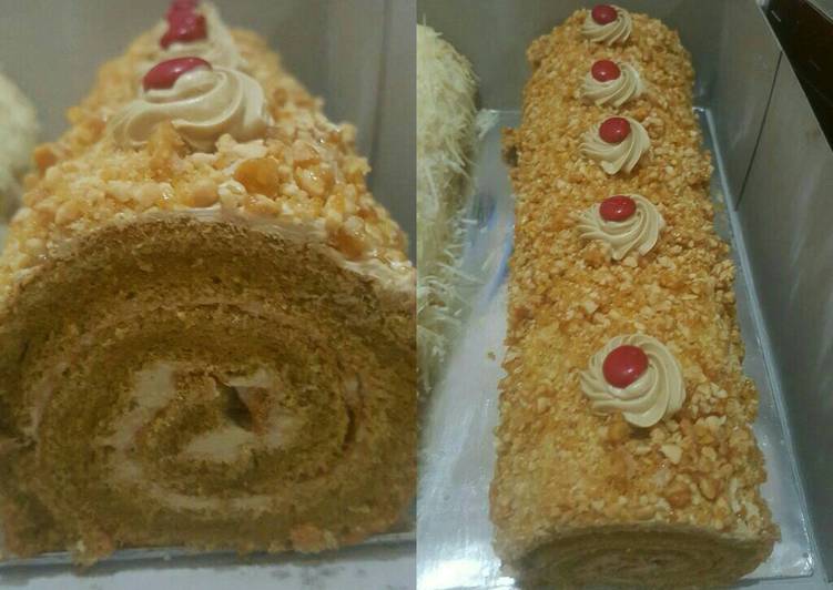 Beri filling mokka pada cake,gulung..laluolesi lagi dengan filling mokka dan taburi nought.